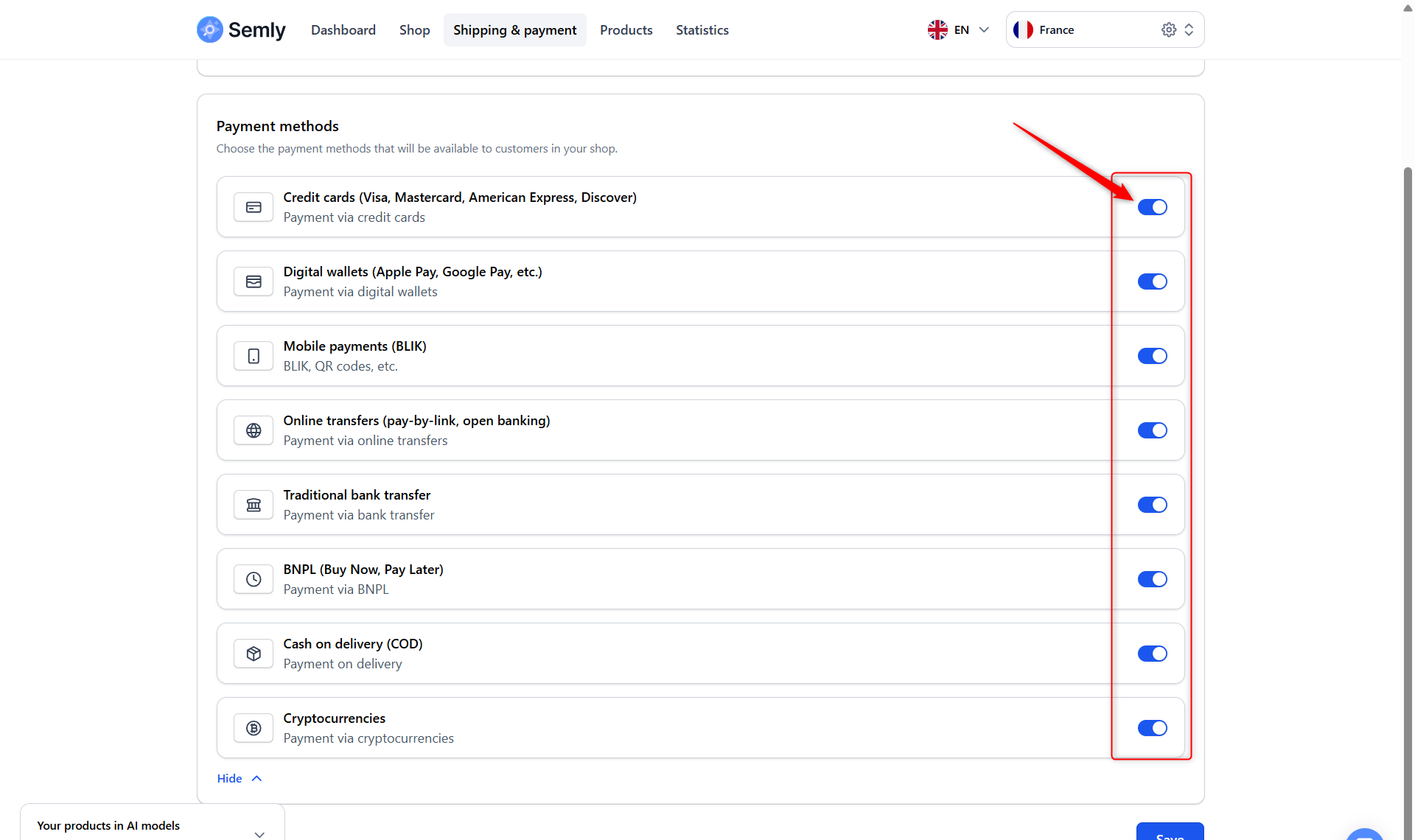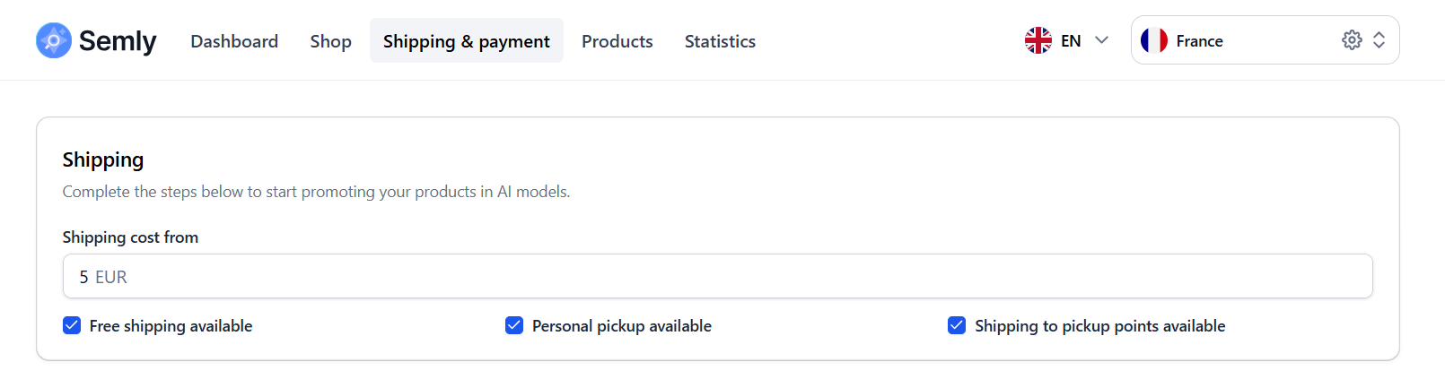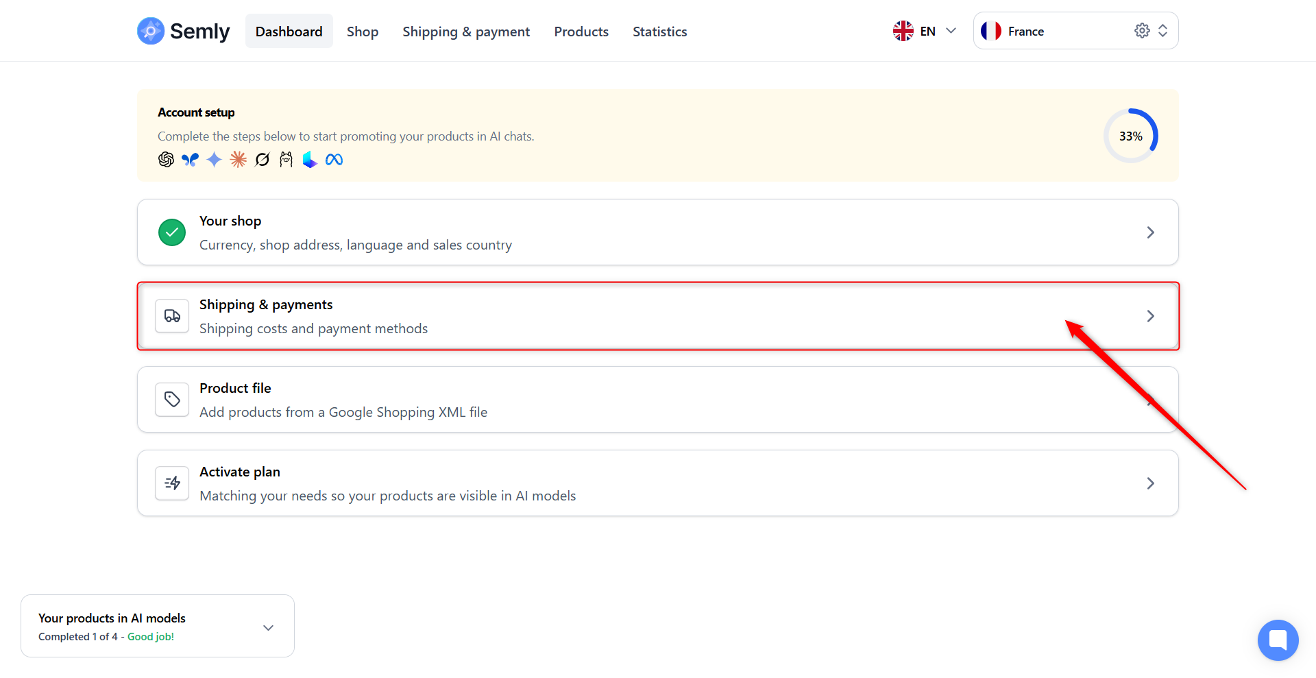 After saving the changes in the first step, you will be automatically redirected to the second step. If this does not happen, go to the main panel and click on the "Shipping & payments" section.
