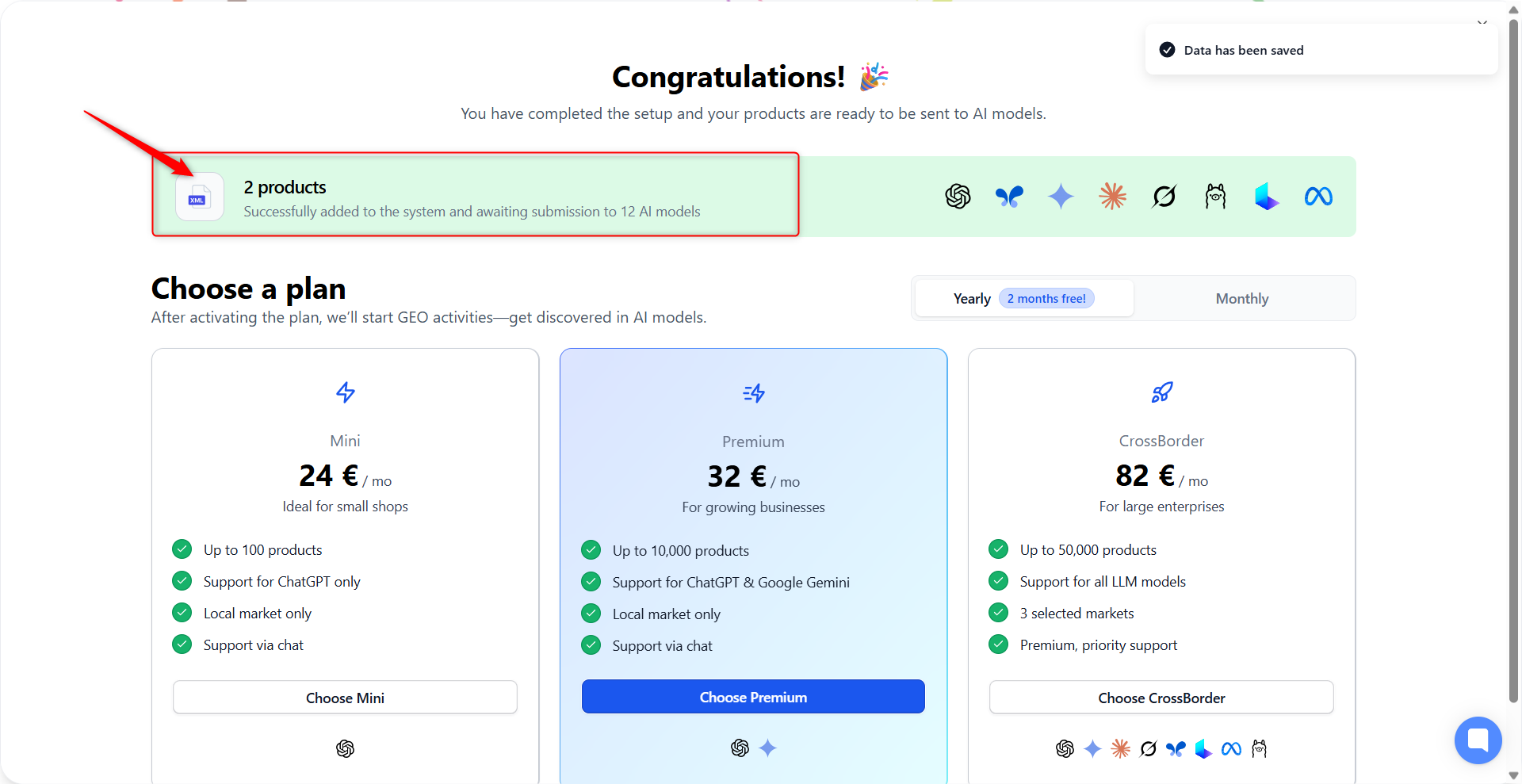 Once the import is complete, you will be redirected to a confirmation page indicating that your account has been successfully configured and all necessary information has been submitted. This enables our team to integrate your store into 12 leading AI models.