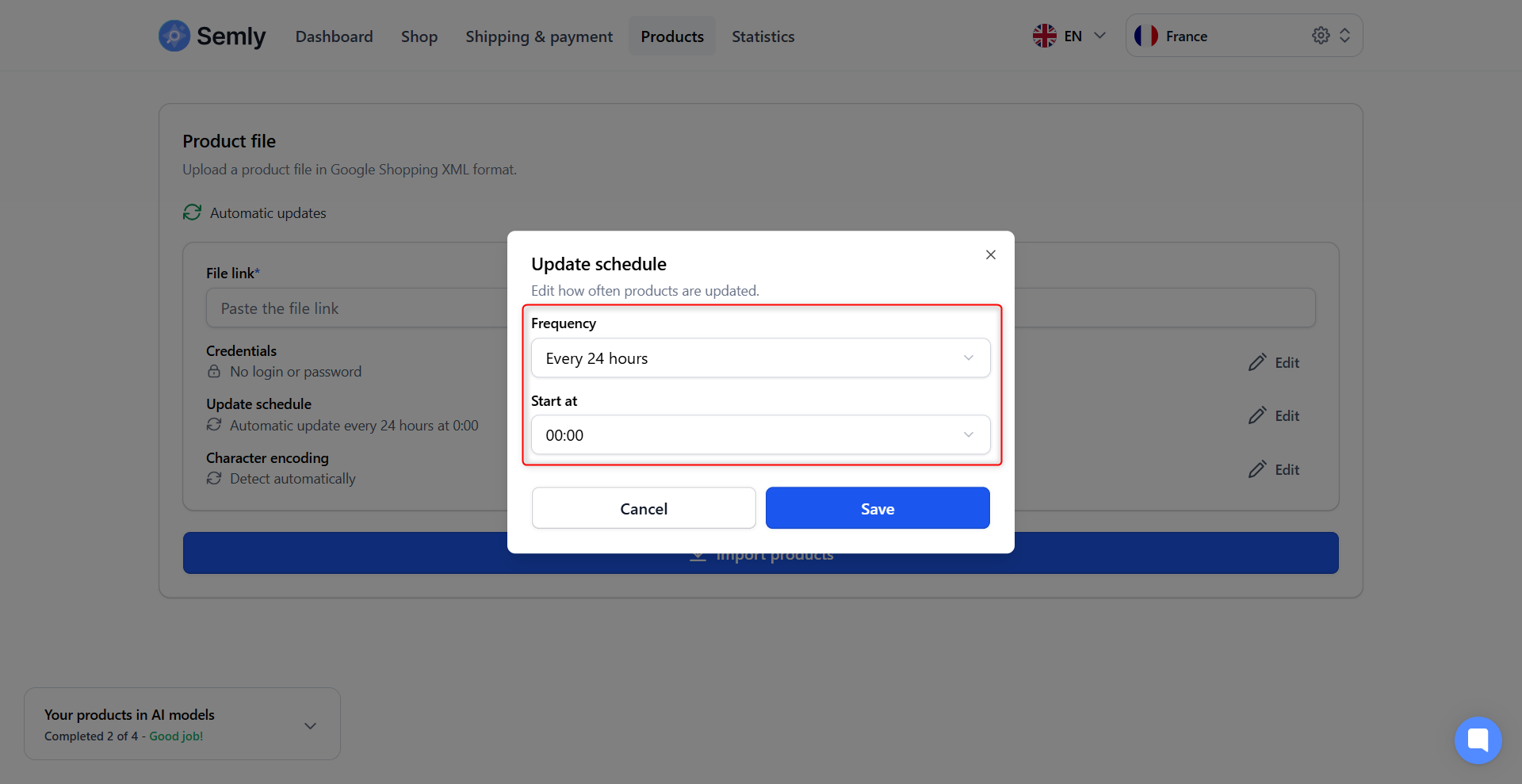 You can also define how often Semly should synchronize your product feed. Specify the interval in hours and the time of day when Semly should perform the update. The default setting is once per day at midnight.