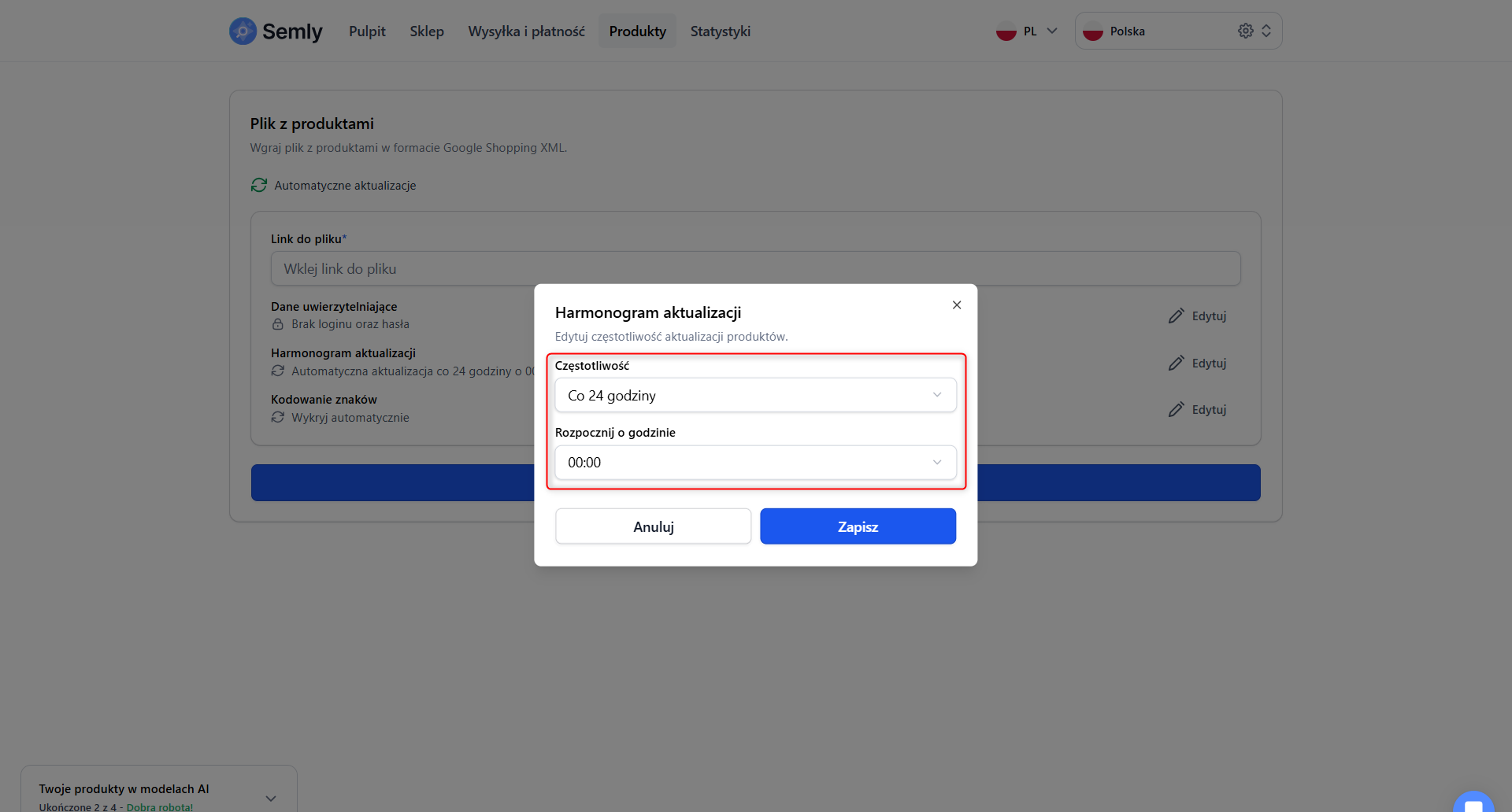 Możesz też ustalić, jak często Semly ma synchronizować Twój feed produktowy. Podaj interwał w godzinach i porę dnia, kiedy Semly ma wykonać aktualizację. Domyślnie jest raz dziennie o północy.