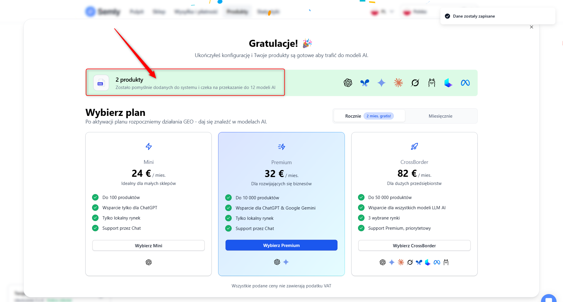 Po zakończeniu importu zostaniesz przekierowany na stronę potwierdzenia, która poinformuje Cię, że Twoje konto zostało poprawnie skonfigurowane i wszystkie niezbędne dane zostały dostarczone. Dzięki temu nasz zespół może zintegrować Twój sklep z wiodącymi modelami AI.