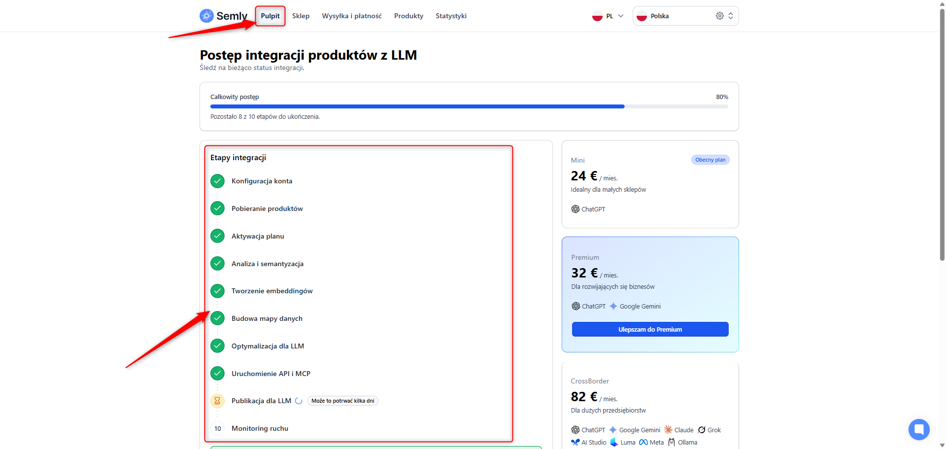 Aby zapewnić jak najlepsze efekty, Semly realizuje proces integracji, który przygotowuje Twoją ofertę do skutecznej współpracy z narzędziami AI, takimi jak ChatGPT, Gemini i inne.